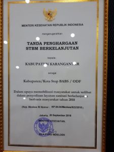 Jakarta 18 Oktober 2018, Pemerintah Kabupaten  Karanganyar menerima penghargaan dari Kementerian Kesehatan sebagai Kabupaten/Kota Stop BABS/ODF dalam upaya memobilisasi masyarakat untuk terlibat dalam penyediaan layanan sanitasi berkelanjutan berbasis masyarakat Tahun 2018.