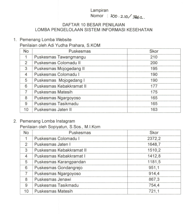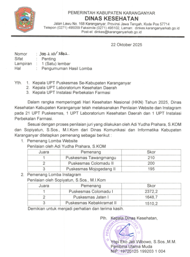 PENGUMUMAN LOMBA PENGELOLAAN SISTEM INFORMASI KESEHATAN (SIK) Okt, Rab, 2025 Dinkes BERITA & INFORMASI , PENGUMUMAN